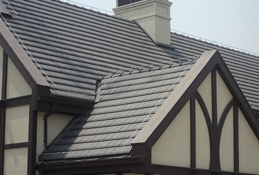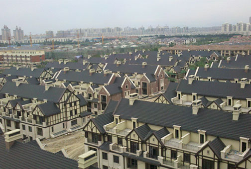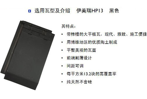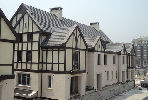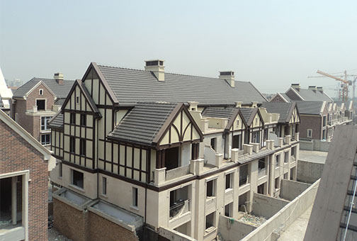 润泽庄园·墅郡选用法国伊美瑞的HP13 黑色带榫槽的大平板瓦,这种瓦型平整、现代、雅致,完全体现了英伦风格建筑的大气沉稳