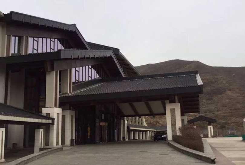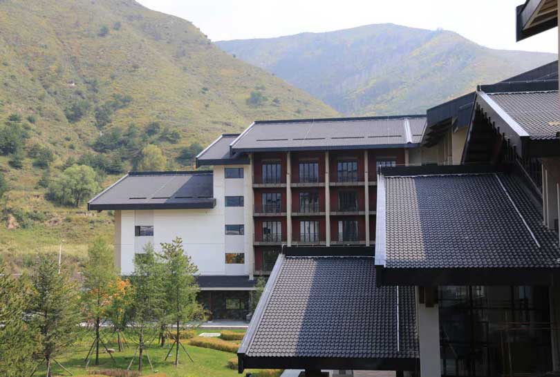 屋顶选用法国伊美瑞的 潘妮 H2黑色瓦,缘于建筑风格和色调统一,另外也考虑到五台山气候寒冷,夏季雨水多的环境因素,需要屋面瓦具有防水抗风以及防冻融等特性,潘妮 H2黑色瓦以优异的性能、和谐的色彩完美地将法国陶土瓦铺在中式建筑的屋顶上。